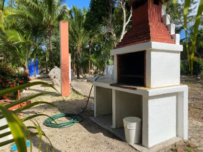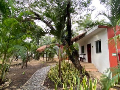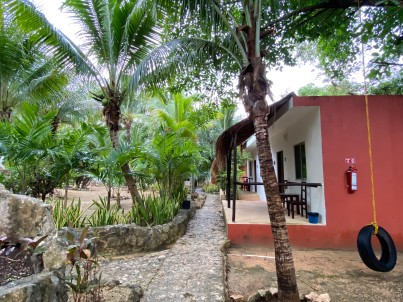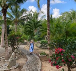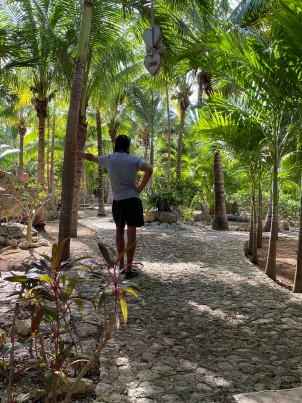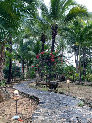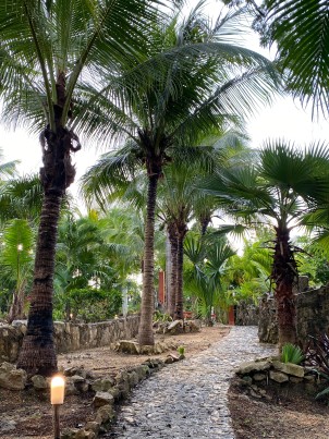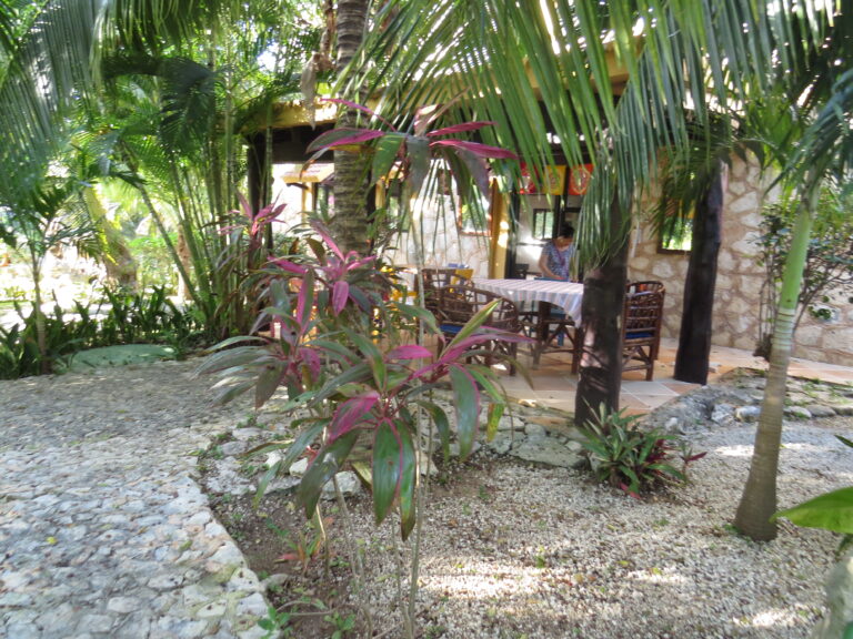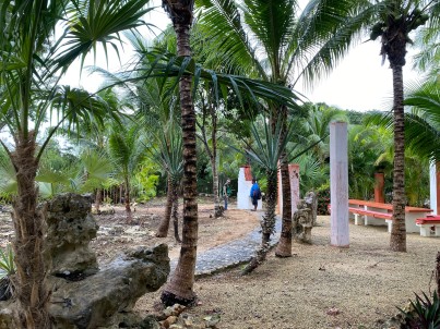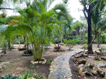 paths wind through rare palms, citrus trees, agaves, exotic flowers, nature-carved rock sculptures, a cenote pond with resident ducks, a brick BBQ oven and a large banquet table. Path lights automatically turn on when it is dim in the night or early morning.